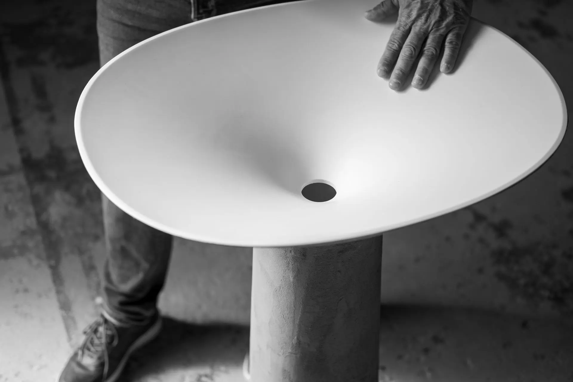 Lotus vrijstaande watael. Incl. vaste afvoerset met bijpassende cover. Gemaakt in wit Velluto® biobased met gekleurde Silt afwerking. Afmetingen 578x478x870mm.